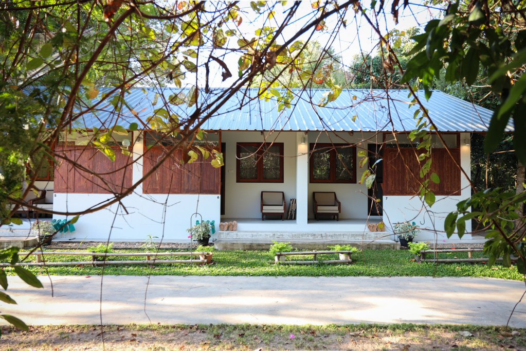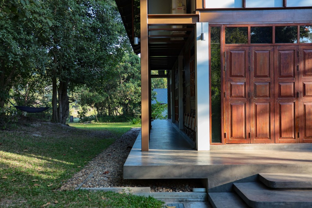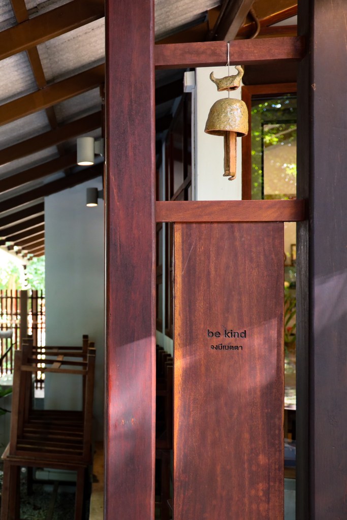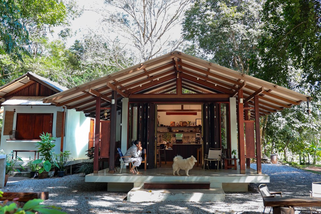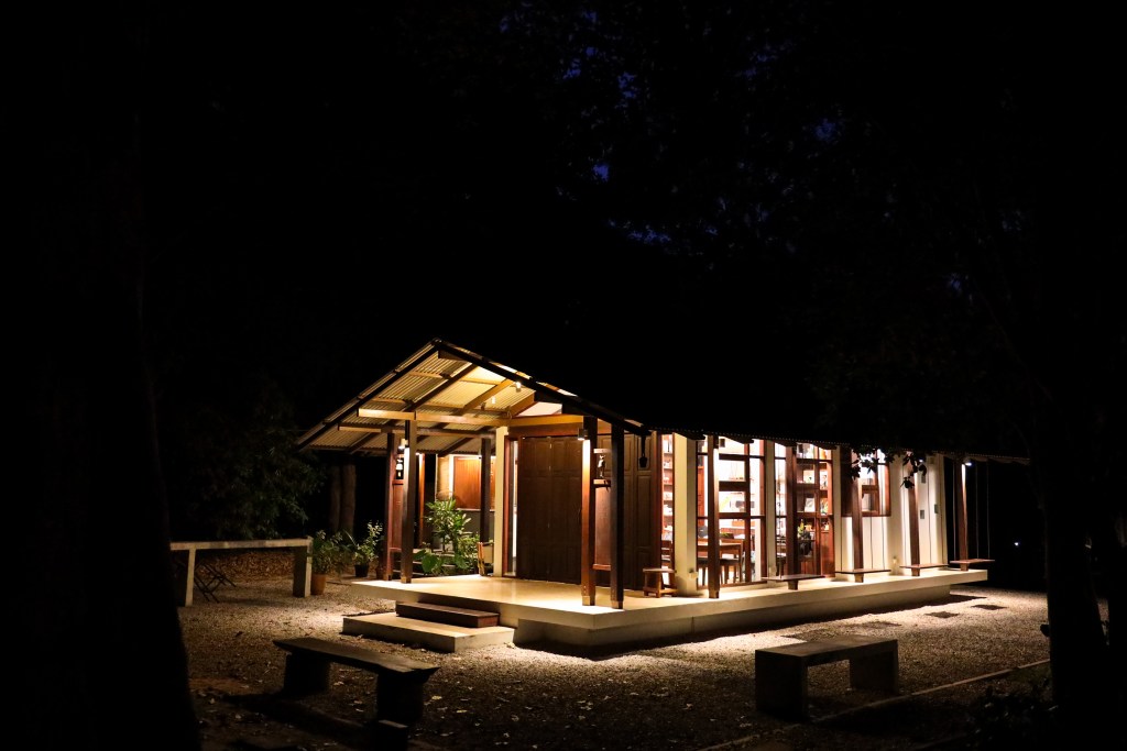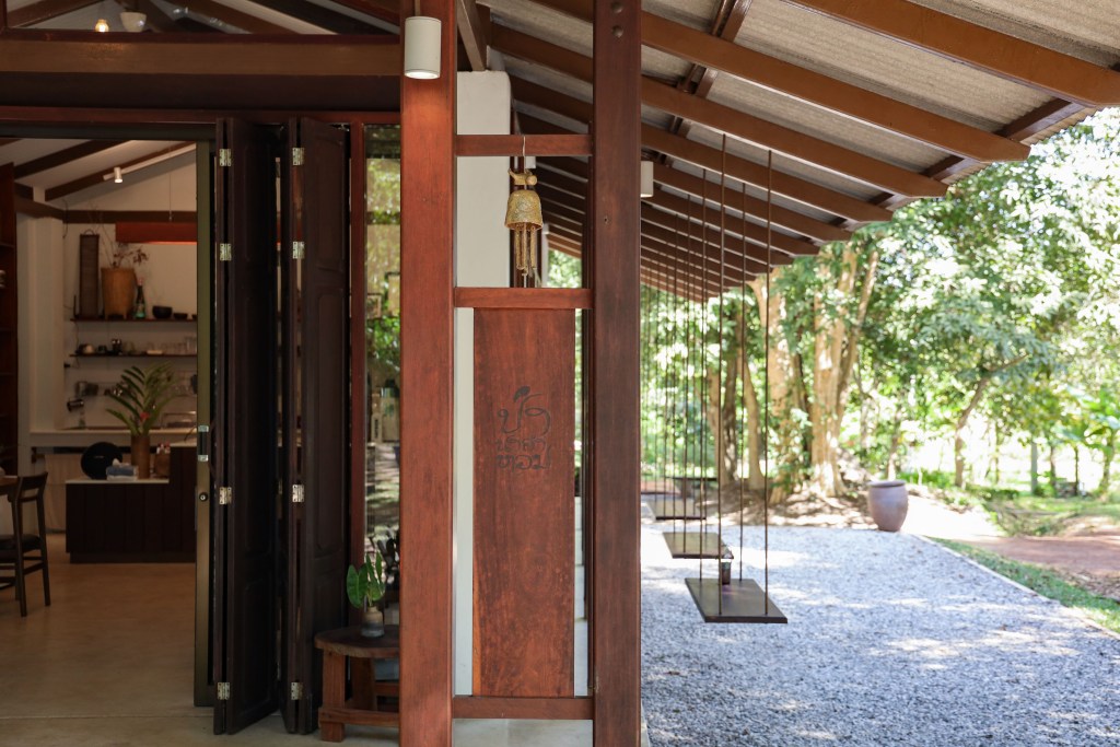 The welcoming area of Pa Na Come Hom. An open space to embrace the forestโs stillness and converse with us on days of rest. The cafรฉ is open on Saturdays and Sundays, serving food and drinks crafted from ingredients with a mindful, honest origin.